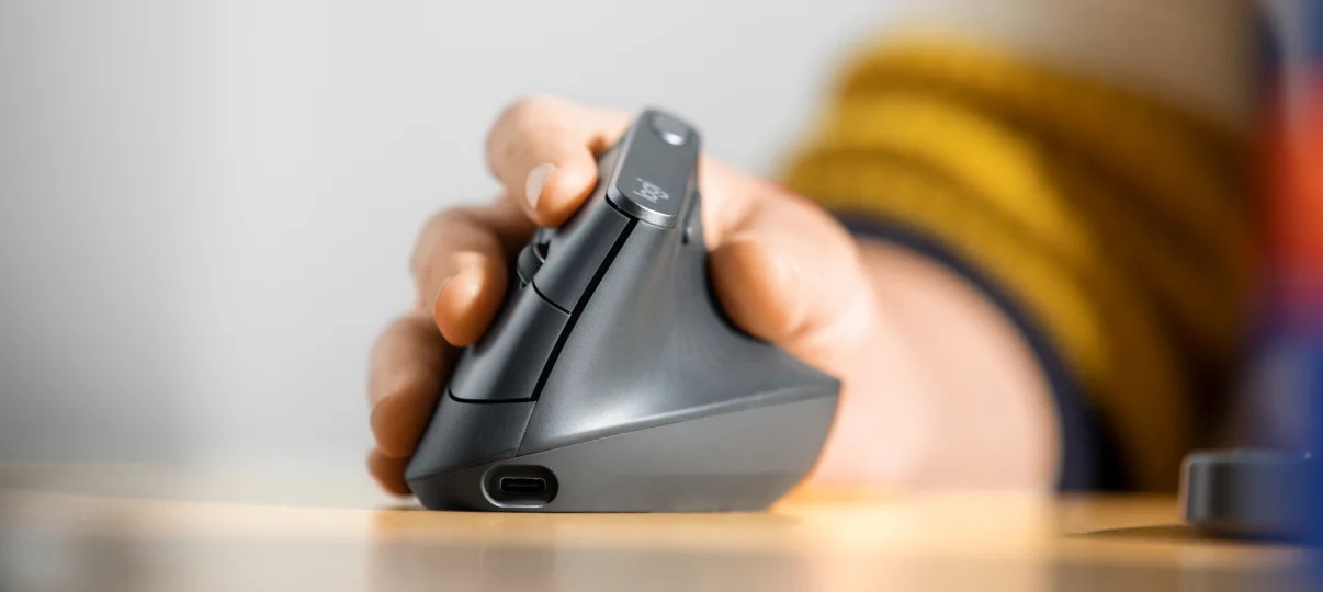 Une souris conçue pour réduire la fatigue et les risques de troubles musculo-squelettiques (TMS) lors de l'utilisation d'un ordinateur. La souris ergonomique est généralement plus large et plus incurvée qu'une souris standard et elle épouse mieux la forme de la main.