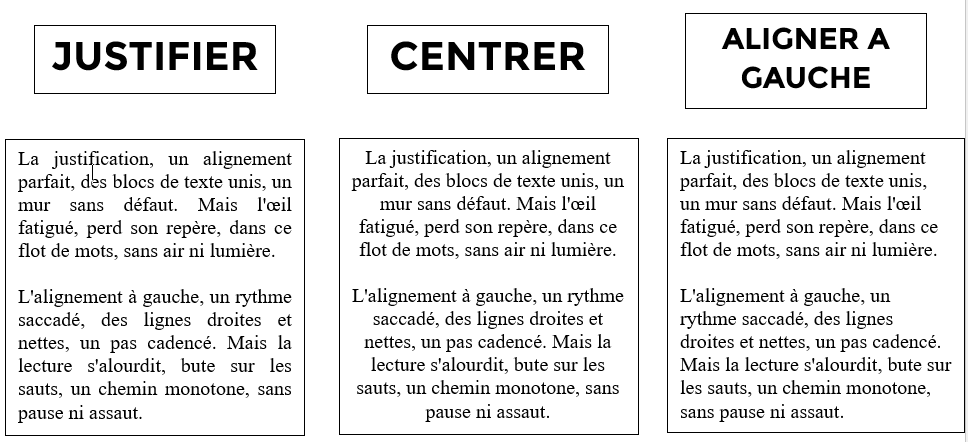 - À éviter: Sur les écrans, la justification peut parfois rendre la lecture difficile, car les espaces entre les mots peuvent être inégaux et créer des "rivières" de blanc qui perturbent l'œil.