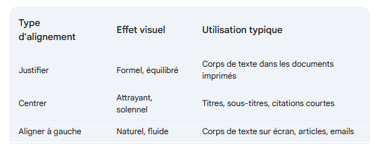 La justification, le centrage et l'alignement à gauche sont trois options de mise en forme qui déterminent l'apparence générale d'un texte sur une page. Chacune offre un effet visuel distinct et convient à des usages spécifiques.